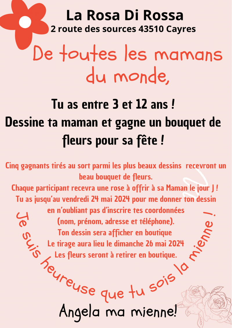 Merci aux enfants pour avoir dessiné leurs jolies mamans 👍💐le tirage au sort se fera en direct en vidéo, les noms des gagnants seront affichés en boutique mis sur le site et réseaux sociaux ( n'oublie pas de venir récupérer ta rose le jour J , si tu ne peux pas venir elle t'attendra à la boutique quand tu veux pour l'offrir à ta maman 💖👸